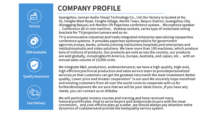 จอภาพยกจอ OLED ไฟฟ้าขั้นสูงจอ LCD เหมาะสำหรับฉากทุกชนิด เรามีเทคโนโลยีการตัดด้วยเครื่องจักร CNC และเทคโนโลยีเลเซอร์ โต๊ะประชุมใหม่ล่าสุดเทคโนโลยีจอ LCD ยกเพื่อให้แน่ใจว่าผลิตภัณฑ์มีมาตรฐานสูงเป็นพิเศษ ตัวยกจอ LCD OLED ทั้งหมดของเราเป็นของ Made in China พร้อมสำหรับการซื้อขายส่ง สามารถปรับแต่งเป็นการส่วนตัวสำหรับลูกค้า และมีตัวยกจอ LCD แบบสัมผัสไฟฟ้าเพียงพอในสต็อกรองรับการจัดส่งที่รวดเร็วให้กับลูกค้า และอุปกรณ์ junnan ของเรามีใบรับรองต่างๆ มากมาย เช่น CCC, ใบรับรอง CE, ROHS, การรับรอง ISO, สินค้ามีความปลอดภัยและมีคุณภาพสูง, มีคุณสมบัติในการส่งออก, เป็นโรงงานโดยตรงในราคาที่ดี, มีโรงงานของตัวเองและเปิดดำเนินการมานานหลายปี